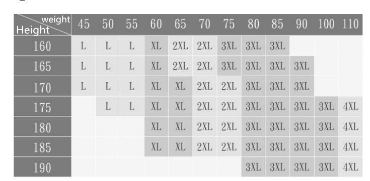 | Size | L | XL | XXL | XXXL | XXXXL |